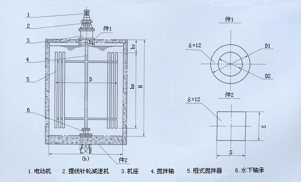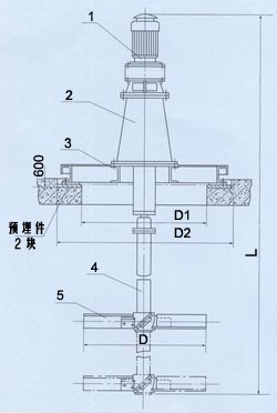 2.1 型號示例 設(shè)備由筒體、攪拌軸及槳葉組成。液下部分可根據(jù)具體攪拌介質(zhì)而確定材質(zhì),一般采用復(fù)合玻璃鋼或不銹鋼制作。