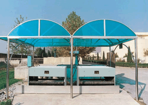 平行弧形的不銹鋼柵條固定于箱體底部,廢水由進水管流入配水箱,使流速降低,并使進水沿箱體篩網均勻分布。流入箱體內的水經篩網柵條垂直下落,大于柵條間隙的水中雜質被截留于柵條表面,然后由旋轉的轉刷由底面撈出,再由刮板清除,順斜板滑落于箱體下方,實現固液分離。 設備機架箱體,轉刷及主傳動軸材質分為碳鋼及不銹鋼二種型式,由用戶定貨任選。