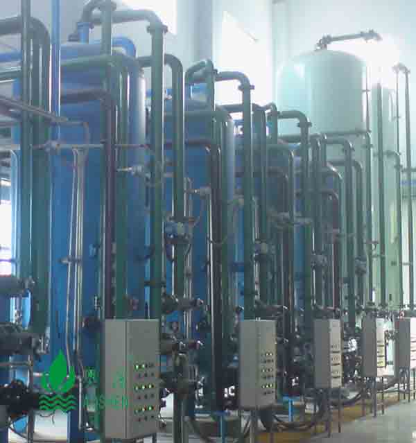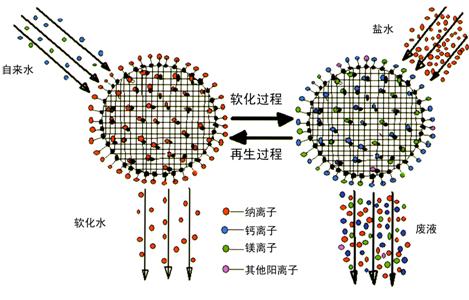 離子交換法是以圓球形樹脂(離子交換樹脂)過濾原水,水中的離子會與固定在樹脂上的離子交換。常見的兩種離子交換方法分別是硬水軟化和去離子法。硬水軟化主要是用在反滲透(RO)處理之前,先將水質硬度降低的一種前處理程序。軟化水設備里面的球狀樹脂,采用特定的陽離子交換樹脂,以鈉離子將水中的鈣鎂離子置換出來,由于鈉鹽的溶解度很高,所以就避免了隨溫度的升高而造成水垢生成的情況。這種方法是目前最常用的標準方式。主要優點是:效果穩定準確,工藝成熟。可以將硬度降至0。采用這種方式的軟化水設備一般也叫做“離子交換器”。 離子交換樹脂是一種聚合物,一種多孔的、不可溶性交換材料,帶有相應的功能基團。利用氫離子交換陽離子,而以氫氧根離子交換陰離子;以包含磺酸根的苯乙烯和二乙烯苯制成的陽離子交換樹脂會以氫離子交換碰到的各種陽離子(例如Na+、Ca2+、Al3+)。同樣的,以包含季銨鹽的苯乙烯制成的陰離子交換樹脂會以氫氧根離子交換碰到的各種陰離子(如Cl-)。從陽離子交換樹脂釋出的氫離子與從陰離子交換樹脂釋出的氫氧根離子相結合后生成純水。