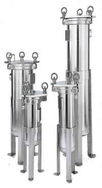 袋式過濾器是通過濾袋,在壓力的作用下,使原液通過濾袋,由被支撐濾藍支撐的過濾袋頂部流入,這使得物料在整個過濾表面能得到均勻分布,過濾介質中流線分布是一致的面,沒有紊流的負效應。液體從過濾袋內流向袋外,濾出的顆粒雜質被截留在過濾袋內部,使得更換過濾袋時不致污染下游的液體,同時也使過濾系統清洗方便。設計在過濾袋內的提手使更換濾袋快速便捷。支撐濾籃的尺寸可由高強度鋼板沖孔制造,也可由不銹鋼絲網而成,這給袋式過濾系統提供了一個大而暢通的過濾表面,從而保證了過濾系統流量大,體積小,防止過濾袋纖維遷移,保證了很高的過濾效率。過濾袋的過濾介質主要有表面過濾網狀材料,深層過濾針氈材料和深層吸附材料。在過濾袋內可安裝專用磁棒或放置活性炭、硅藻土,以去除鐵性雜質或吸附有機物。