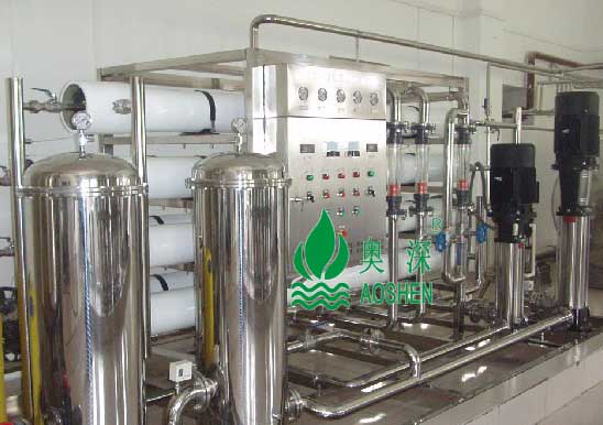 ●源水(箱)→源水泵→機械過濾器→活性炭過濾器→軟水器(根據水的硬度來選用)→精密過濾器→高壓泵→反滲透裝置→中間水箱→陰陽離子混合床→紫外線殺菌器→微孔過濾器→用水點